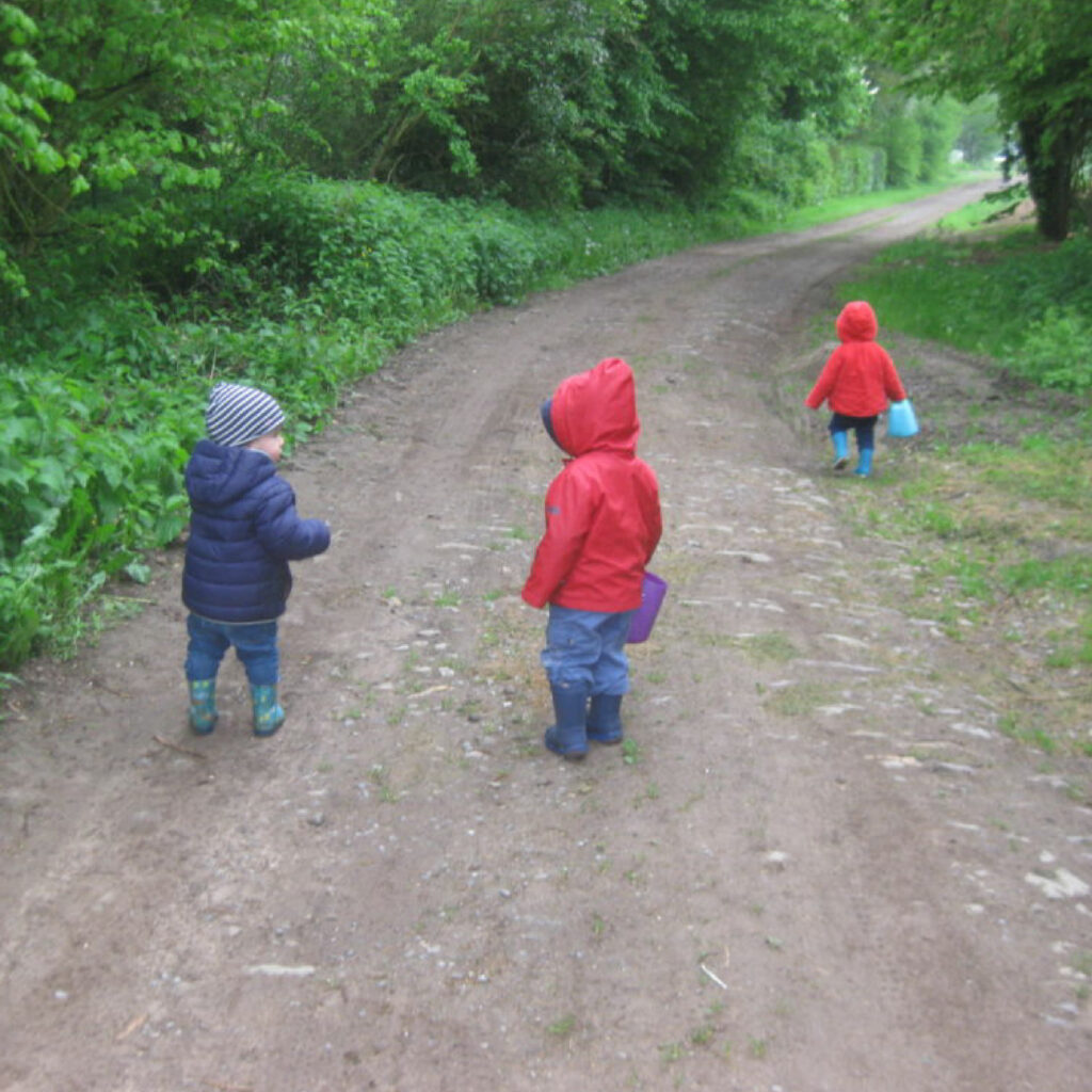 Ce matin, le temps est chagrin par rapport aux précédents jours ensoleillés . Impossible d’aller à la plaine de jeux : les agrès sont mouillés. Nous chaussons nos bottes, enfilons nos manteaux et installons Victoria dans la poussette. Après le passage de la barrière chacun prend sa place autour du caddie. Quelques mètres sur la route puis nous bifurquons sur le chemin de terre empierré où les enfants peuvent courir librement. Odile ramasse un caillou pour le mettre dans son « seau aux trésors ». Adrien lui, préfère deux petites prunes encore vertes du début de l’allée. Les aigrettes de pissenlit sont tentantes, Adrien veut en souffler les délicates graines à parachute, malheureusement elles sont trempées et ne décollent pas.