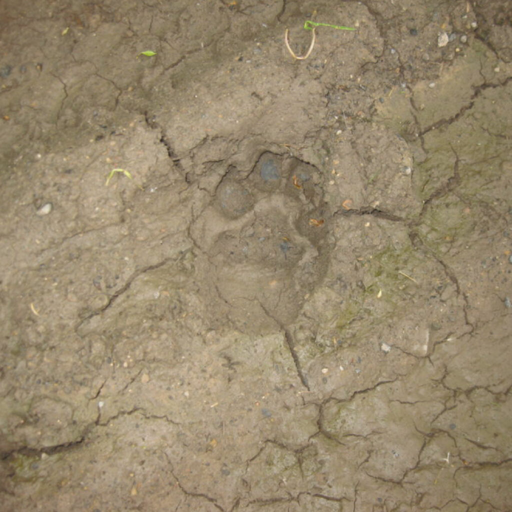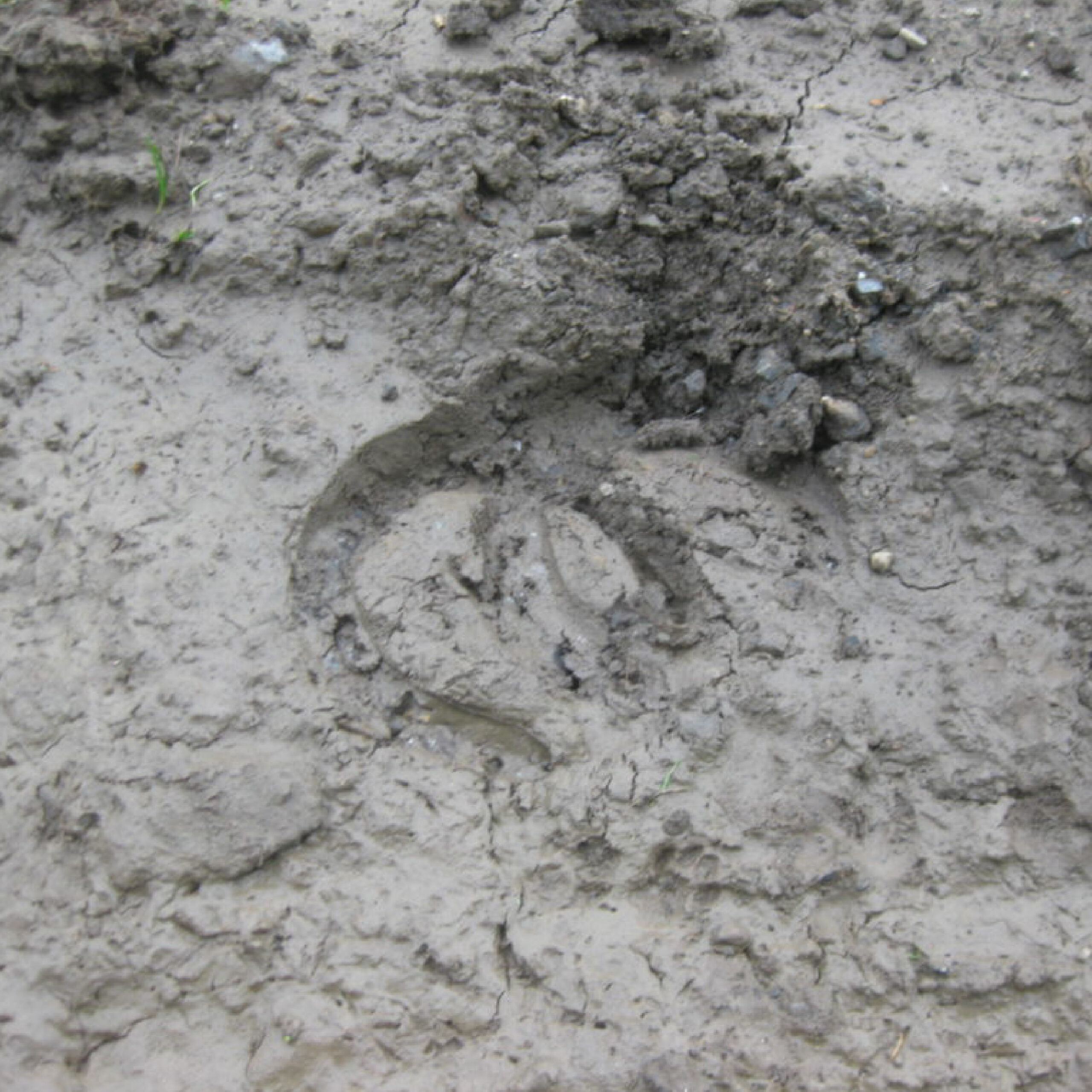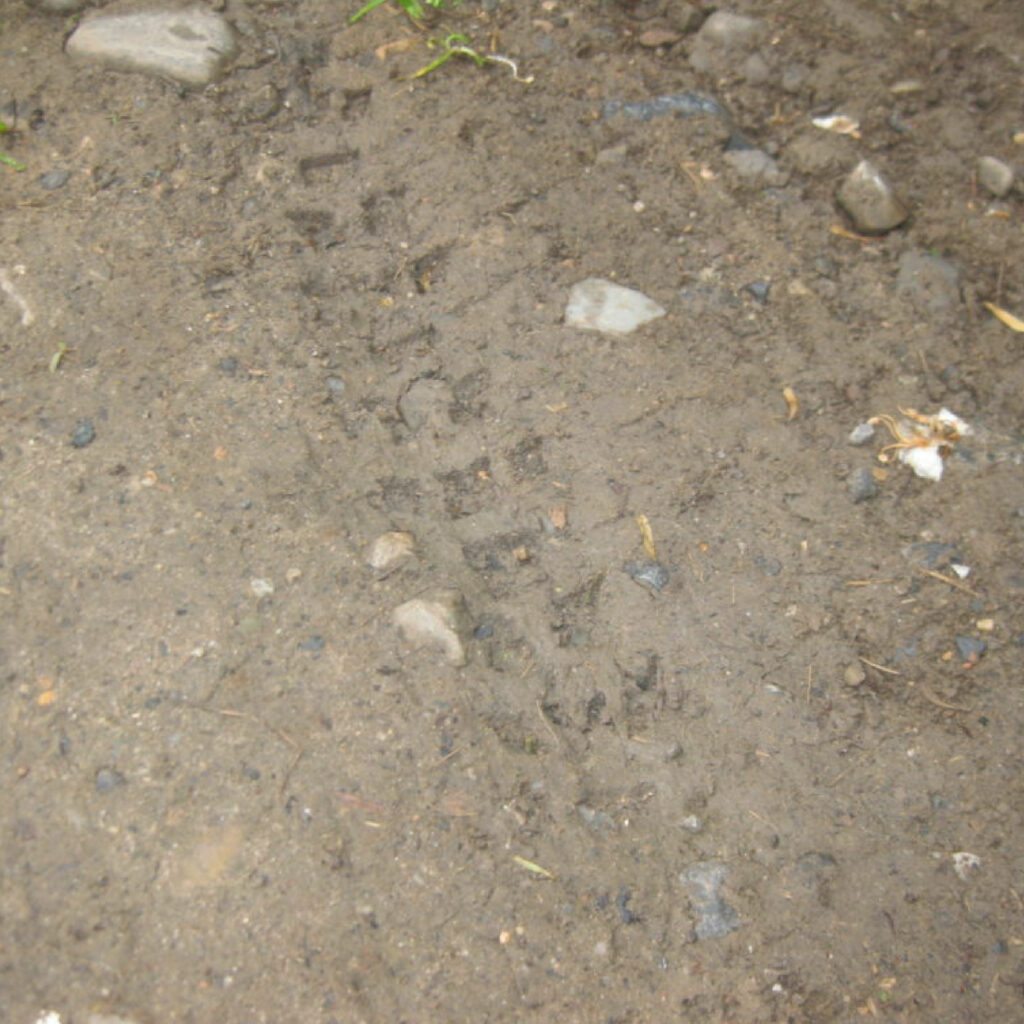 Dans l’ancienne flaque d’eau évaporée, nous admirons les empreintes d’un cheval et, celles de Dora l’énorme chienne d’une voisine. Les traces de tracteurs et de vélos sont également bien visibles.
